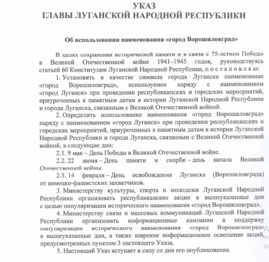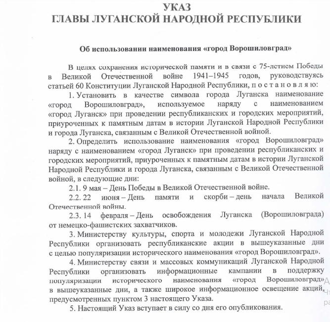 Глава ЛНР Леонид Пасечник подписал указ «Об использовании наименования "город Ворошиловград"».