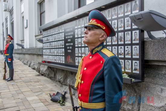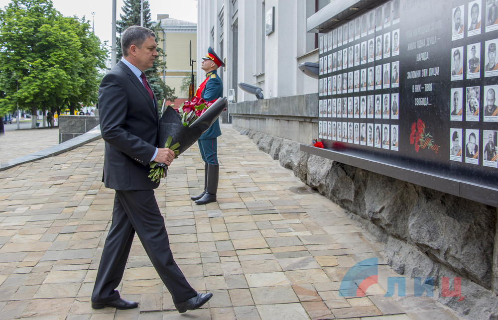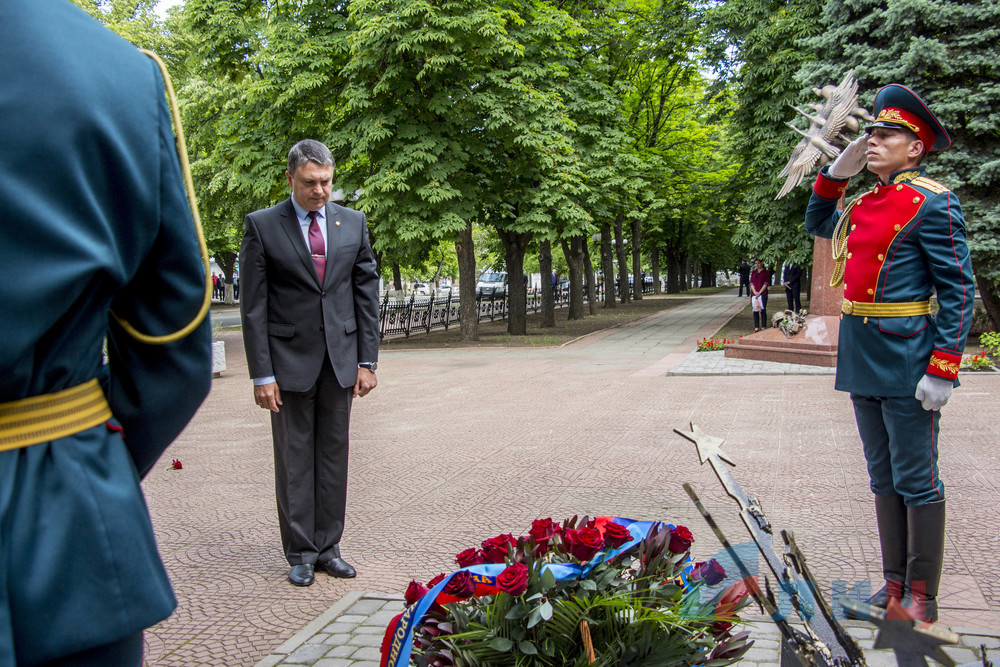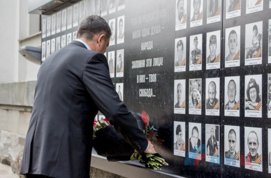 Глава ЛНР Леонид Пасечник почтил память погибших в результате авиаудара киевских силовиков по зданию бывшей Луганской областной администрации 2 июня 2014 года.