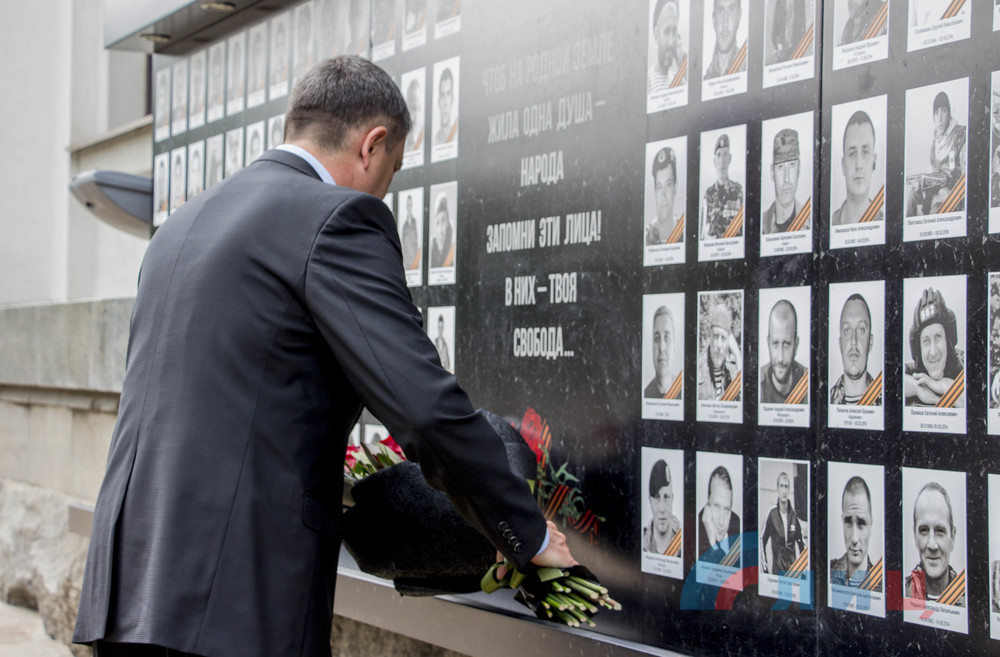Сообщается, что глава Республики в сопровождении почетного караула Народной милиции возложил цветы к памятному знаку «Жертвам авиаудара ВСУ», а также к «Стенду Памяти» по погибшим за свободу Донбасса, установленному на фасаде Дома правительства.