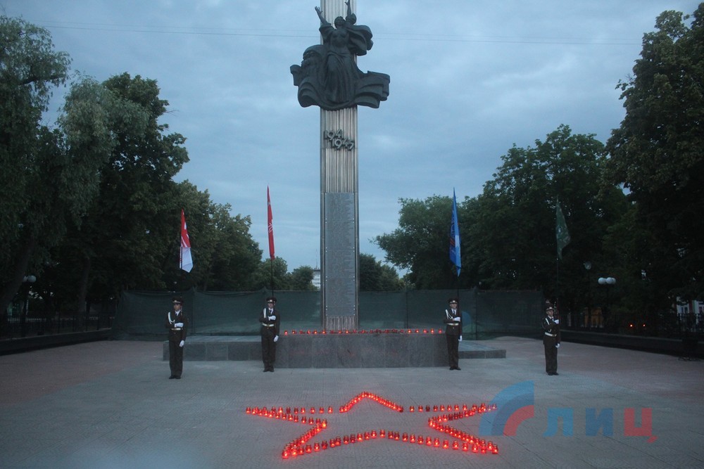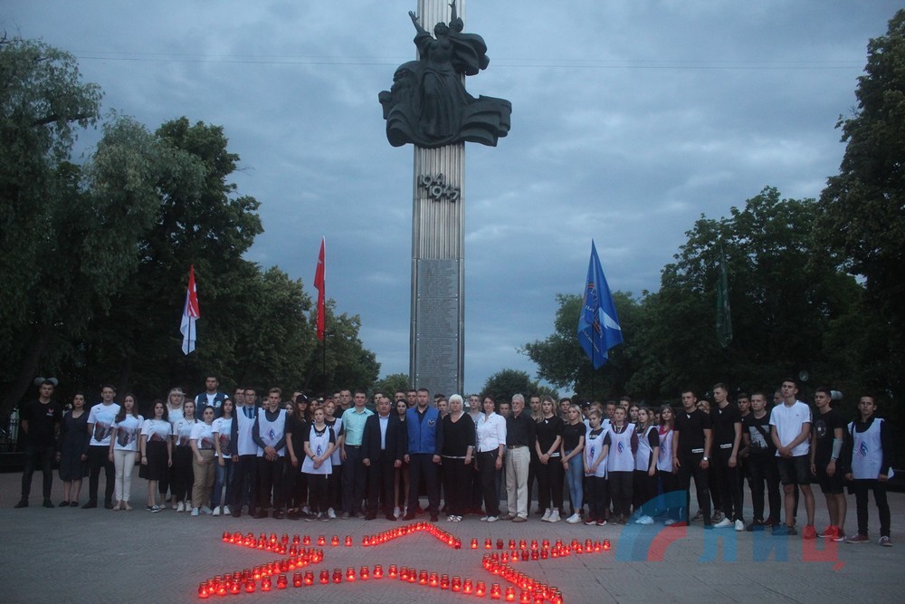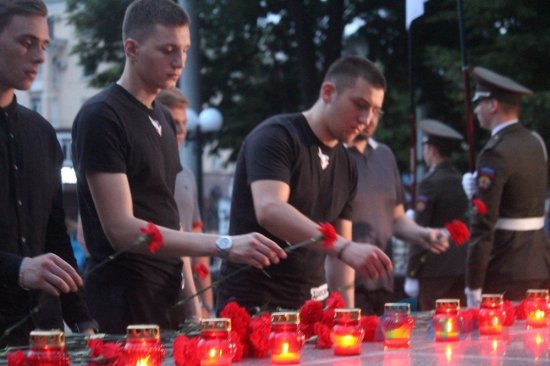В 04.00 - время нападения гитлеровской Германии на СССР в 1941 году - на площади перед пилоном активисты выложили из лампадок красную звезду, символизирующую героизм советского народа.