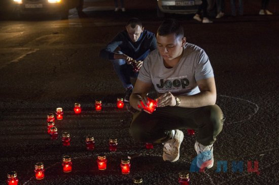 Участники акции выложили из зажженных лампад надпись «Остановите войну!», затем почтили память погибших жителей Луганска минутой молчания. В память о погибших активисты также выпустили в небо более 100 светящихся белых шаров.