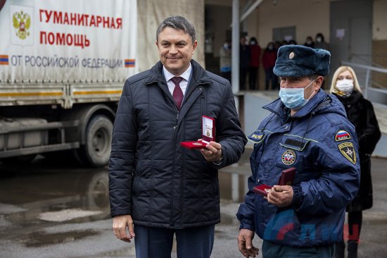 Глава ЛНР Леонид Пасечник вручил награды спасателям МЧС России, которые в течение шести лет осуществляли доставку гуманитарной помощи в Республику.