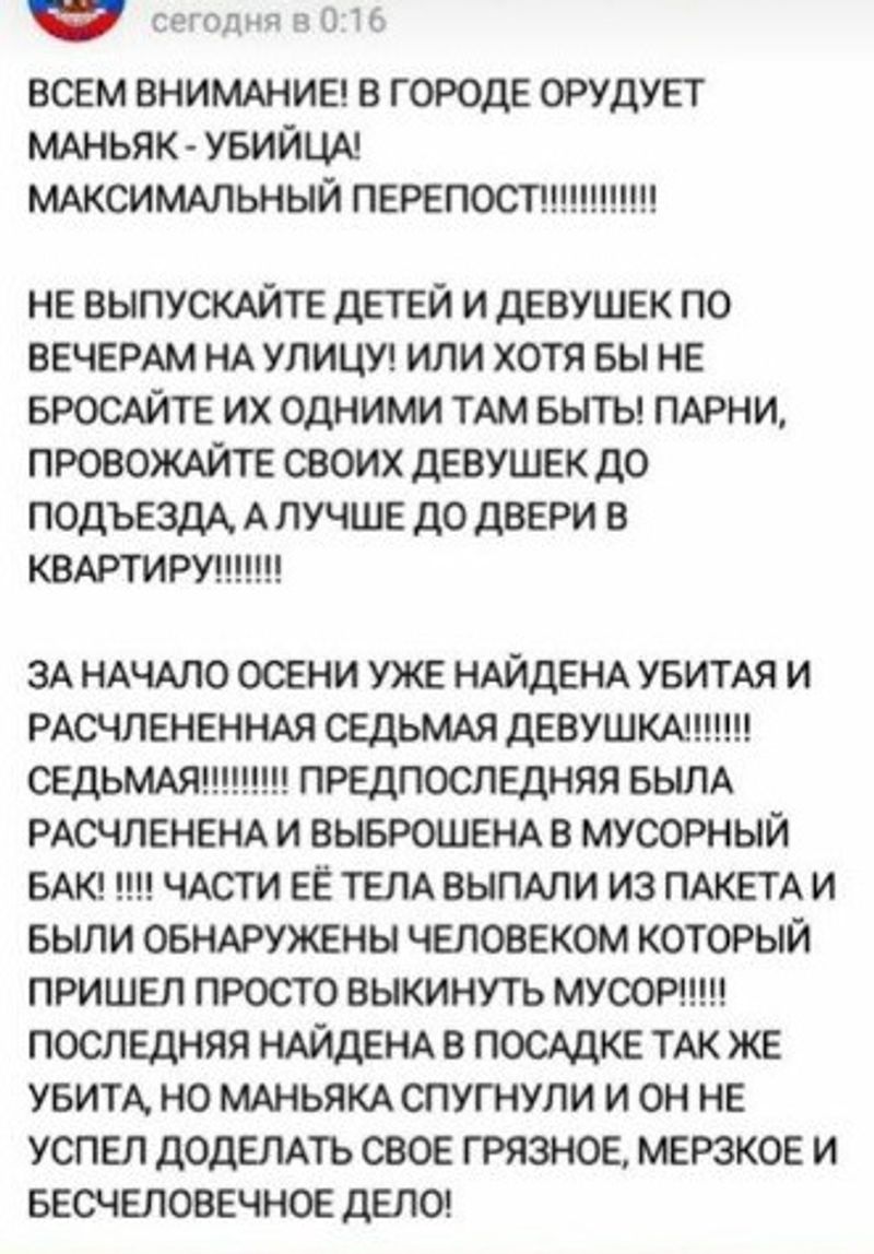 Отметим, что в социальной сети «ВКонтакте» до сих пор продолжает распространяться информация о том, что в Луганске орудует серийный маньяк. Как отмечают пользователи, на квартале Южном нашли два трупа девушек. В пятницу, 6 октября, около ЛГМУ нашли тело обезглавленной девушки, а несколькими днями ранее труп без головы был обнаружен на квартале Ватутина.