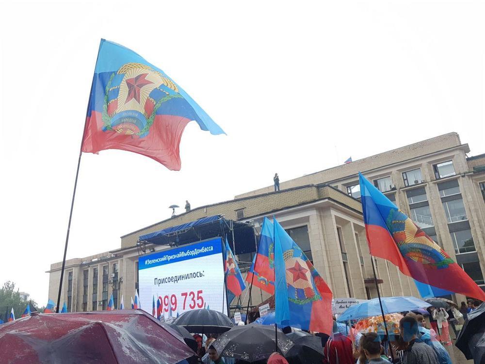 В рамках акции, проходящей в Парке кованных фигур в центре Донецка, около 3000 людей пришли с транспарантами со следующими лозунгами: «Нас миллион!! Зеленский, как слышно?», «Донбасс сделал свой выбор! Что скажешь, Зе?», «Выбор Донбасса – русский язык!», «Зеленский, верни пенсии!».