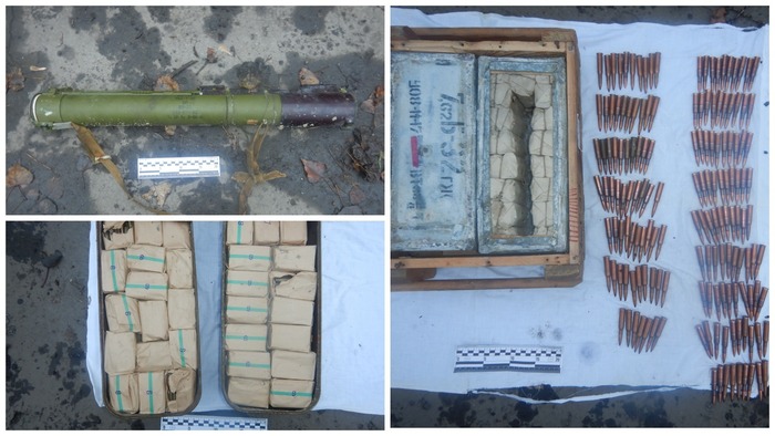 В ходе отработки оперативной информации сотрудниками уголовного розыска Краснолучского ГОВД МВД ЛНР в районе одной из улиц города обнаружено и изъято: гранатомет РПГ-22, три гранаты Ф-1, граната РГД-5, выстрел ВОГ-25, три запала УЗРГМ, 3551 патрон калибра 5,45 мм, 936 патронов калибра 7,62 мм, 15 патронов калибра 9 мм.