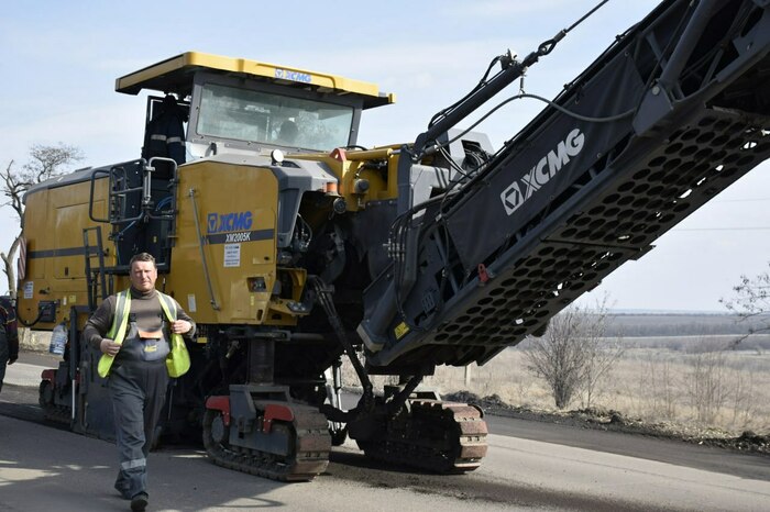 На участке дороги в настоящий момент выполняются работы по фрезерованию и расчистке дорожного полотна, в том числе по разминированию, устранению лишней растительности, избыточного грунта.