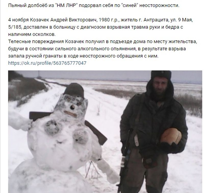 Так, по информации группы, житель Антрацита Андрей Козачек госпитализирован с диагнозом взрывная травма руки и бедра с наличием осколков. Отмечается, что телесные повреждения Козачек получил в подъезде дома по месту жительства, в результате взрыва запала ручной гранаты в ходе неосторожного обращения с ним.
