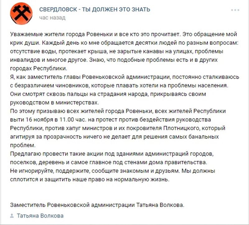 В социальной сети появилась информация о том, что заместитель Ровеньковской администрации Татьяна Волкова призывает жителей города выйти на протест против бездействия руководства Республики.