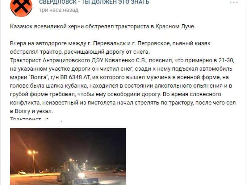 Как рассказал сам тракторист Антрацитовского ДЭУ Коваленко, примерно в 21:30 на указанном участке дороги он чистил снег, сзади к нему подъехал автомобиль марки «Волга». Водитель, находясь в состоянии алкогольного опьянения, в грубой форме требовал, чтобы ему освободили дорогу. Во время словесного конфликта неизвестный из пистолета начал стрелять по трактору, после чего сел в авто и уехал.