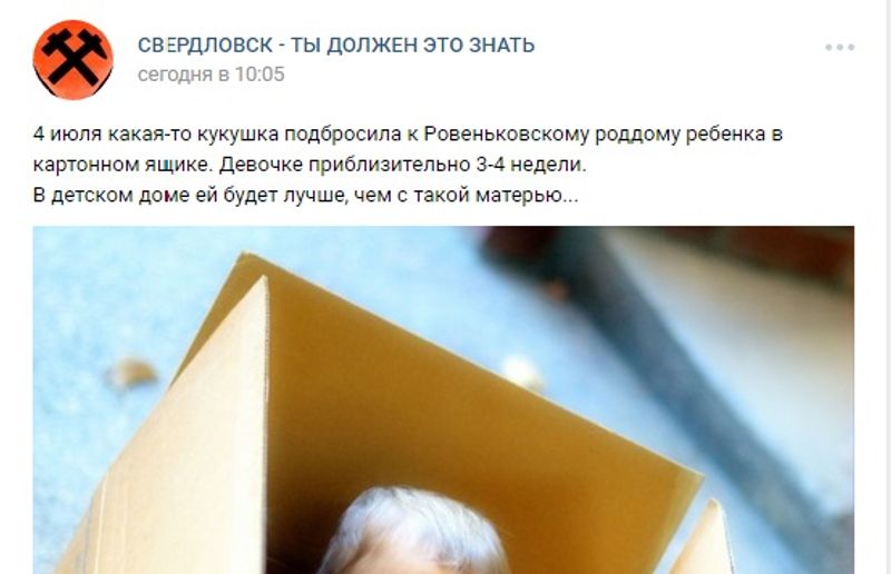 Отмечается, что ребенка нашли возле роддома в картонном ящике. Девочке приблизительно 3-4 недели. Кто именно оставил новорожденную под дверью роддома - неизвестно.