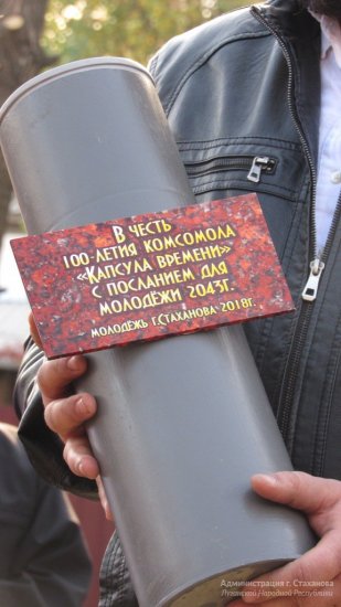 Председатель Стахановского отделения Молодёжной общественной организации «Молодая гвардия» Общественного движения «Мир Луганщине» Евгений Матяшов передал директору историко-художественного музея Ирине Мишиной «капсулу времени» с посланием молодёжи к будущим поколениям. Капсула будет вскрыта через 25 лет в 2043 году, а до этого времени она будет храниться в городском музее. В сосуде, который представляет собой гильзу от артиллерийского снаряда, хранятся фотографии достопримечательностей города, сувениры, выпуск городской газеты «Стахановское знамя», флэш-карта с видеообращением к потомкам.