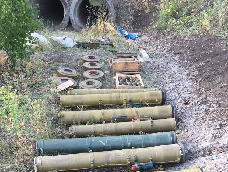В ходе осмотра в тайнике обнаружено и изъято девять противотанковых управляемых ракет, два гранатомета РПГ-26, гранатомет РПГ-18, девять выстрелов к ручному гранатомету ПГ-7С, выстрел к ручному гранатомету с маркировкой Б 13-126, девять пороховых зарядов к ручному гранатомету ПГ-7ПМ, шесть мин ТМ-62М, три мины МОН-50, пять взрывателей МВЧ-62. В тайнике также хранились 48 гранат различных модификаций, 21 запал УДЗ, запал УЗРГМ, 30 кг пластита и 3,25 кг взрывчатого вещества «гремикс», две тротиловые шашки весом 200 граммов каждая и одна 400-граммовая тротиловая шашка.