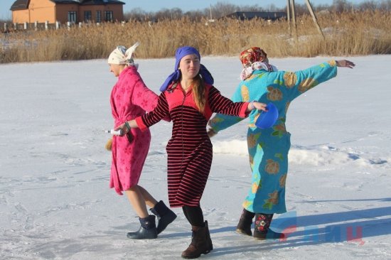 Женская часть коллектива луганского клуба закаливания и зимнего плава поздравила мужчин с 23 февраля концертной программой у проруби