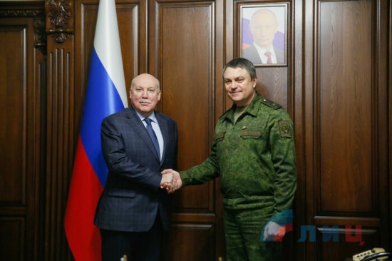 И.о. главы ЛНР Леонид Пасечник встретился с прибывшим в Республику государственным секретарем Союзного государства России и Беларуси Дмитрием Мезенцевым