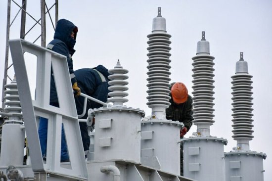Специалисты компании «Энергосетьстрой» устанавливают новый трансформатор на подстанции, питающей одну из котельных Луганска