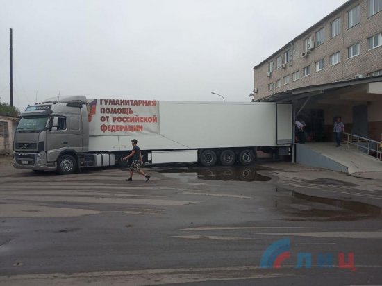 Автомобили 85-го конвоя Министерства чрезвычайных ситуаций России с гуманитарной помощью для жителей Донбасса прибыли на склады в Луганске