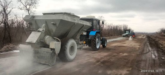 Специалисты выполняют ремонт верхнего слоя асфальтобетонного покрытия участка дороги, связывающей село Роскошное с Луганском.