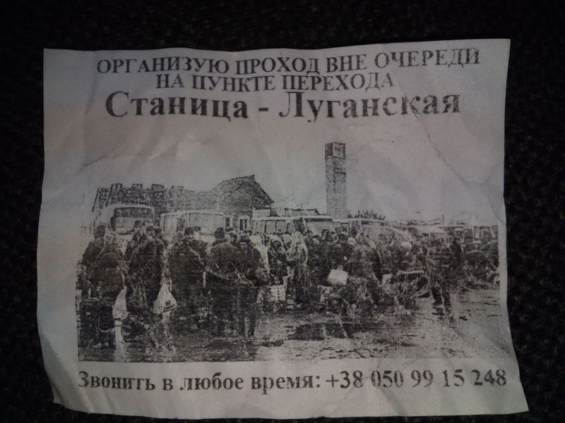 Женщина отметила, что во время ожидания в очереди на украинской стороне получила рекламную листовку с предложением «ускорить» процесс.