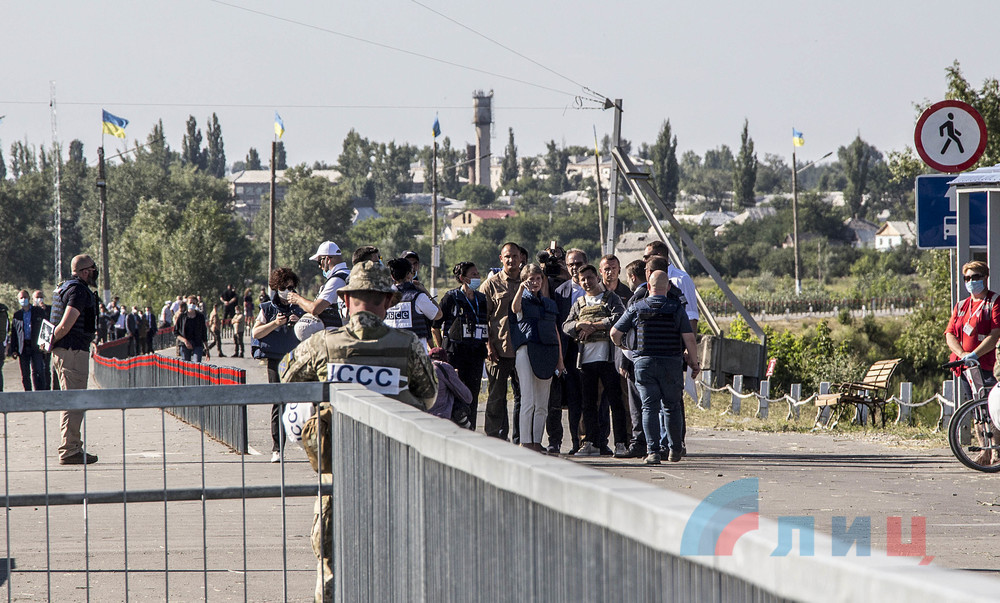 Президенты Швейцарии и Украины Симонетта Соммаруга и Владимир Зеленский посетили контрольный пункт въезда-выезда в районе Станицы Луганской у моста через реку Северский Донец.